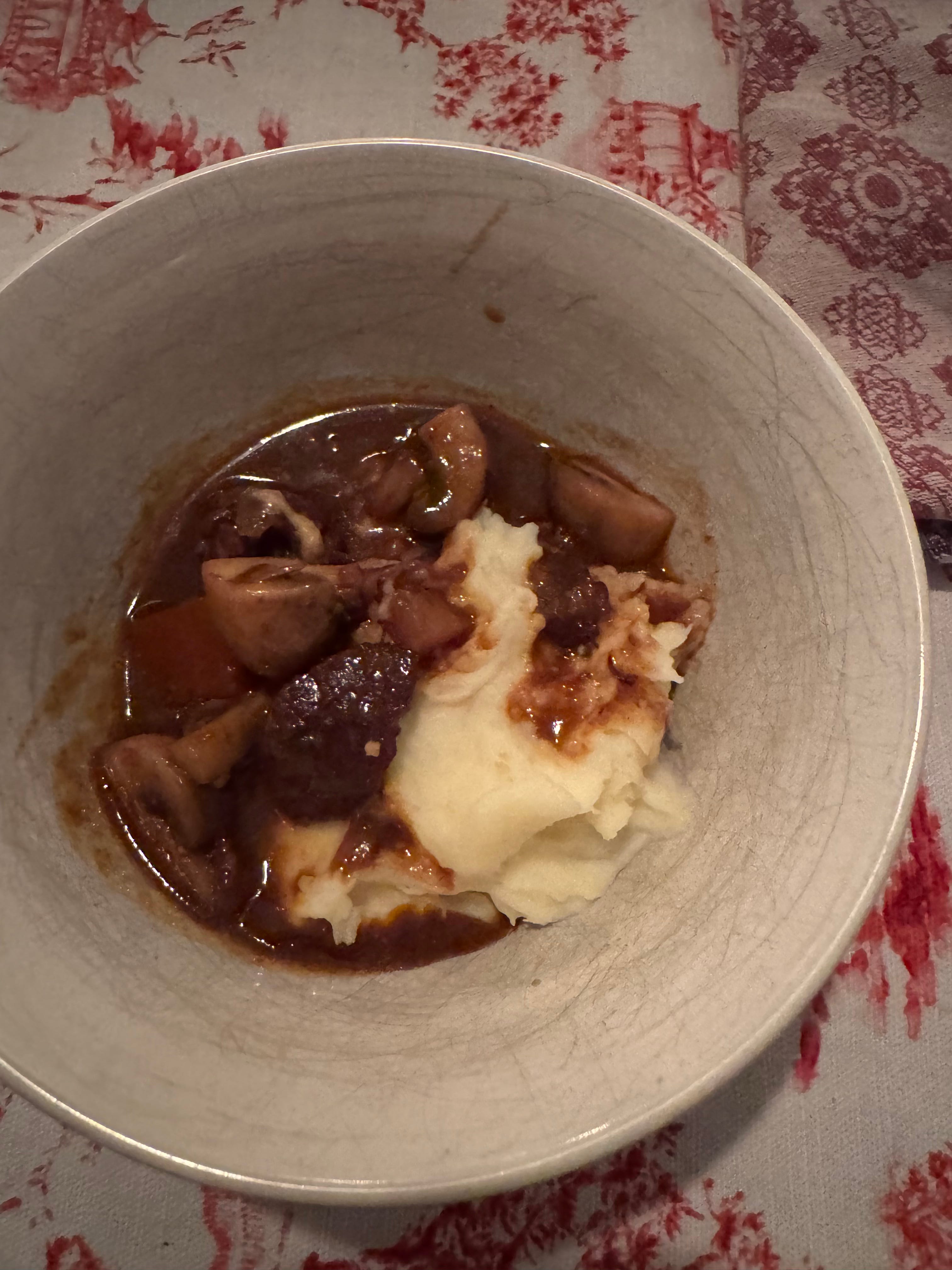 Beef Bourguignon and mashed potatoes to be exact. I made it once and ate for a few days following. This was not a time for lighter fare. My cells were being regenerated.